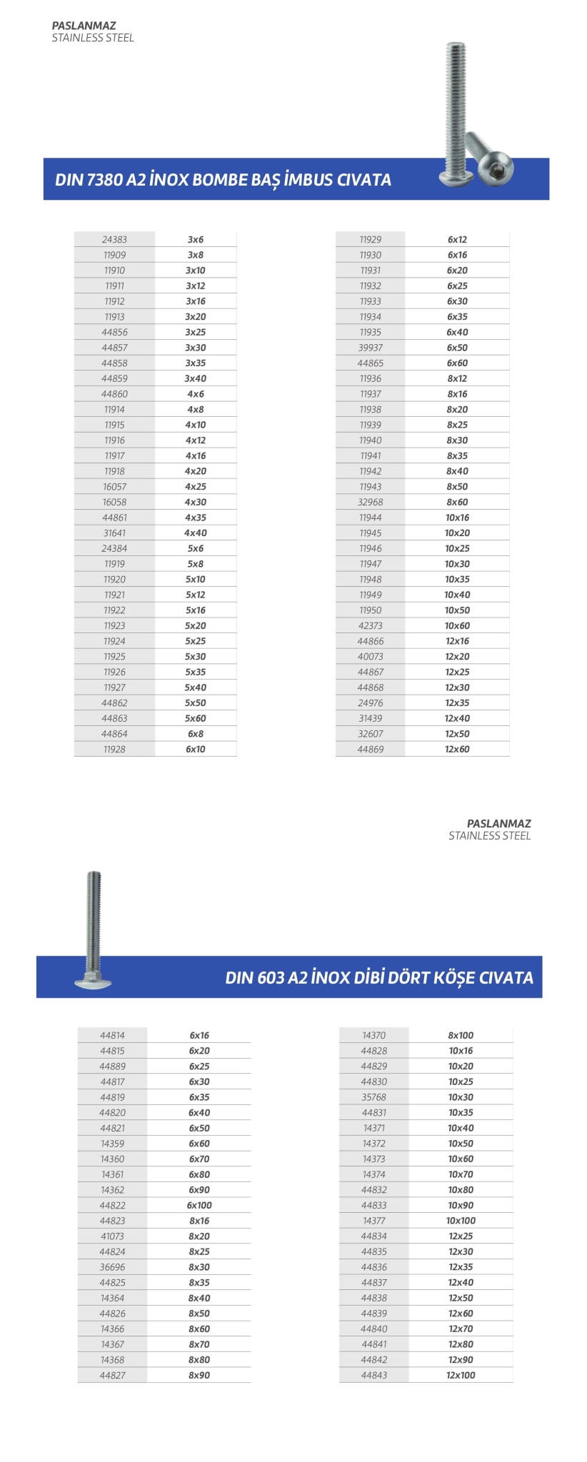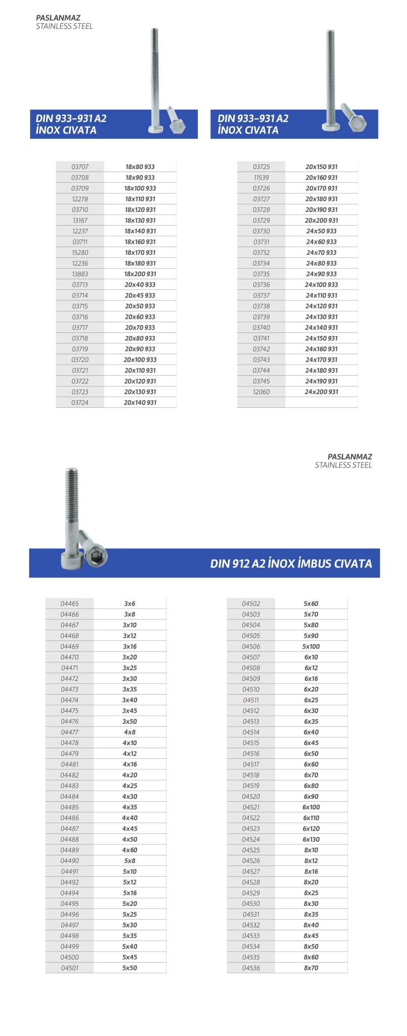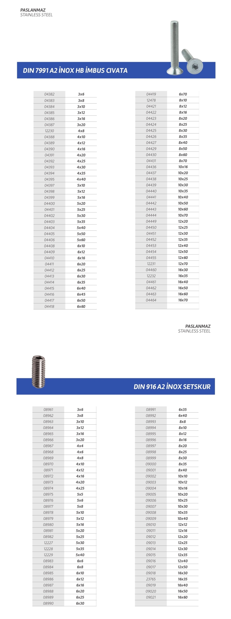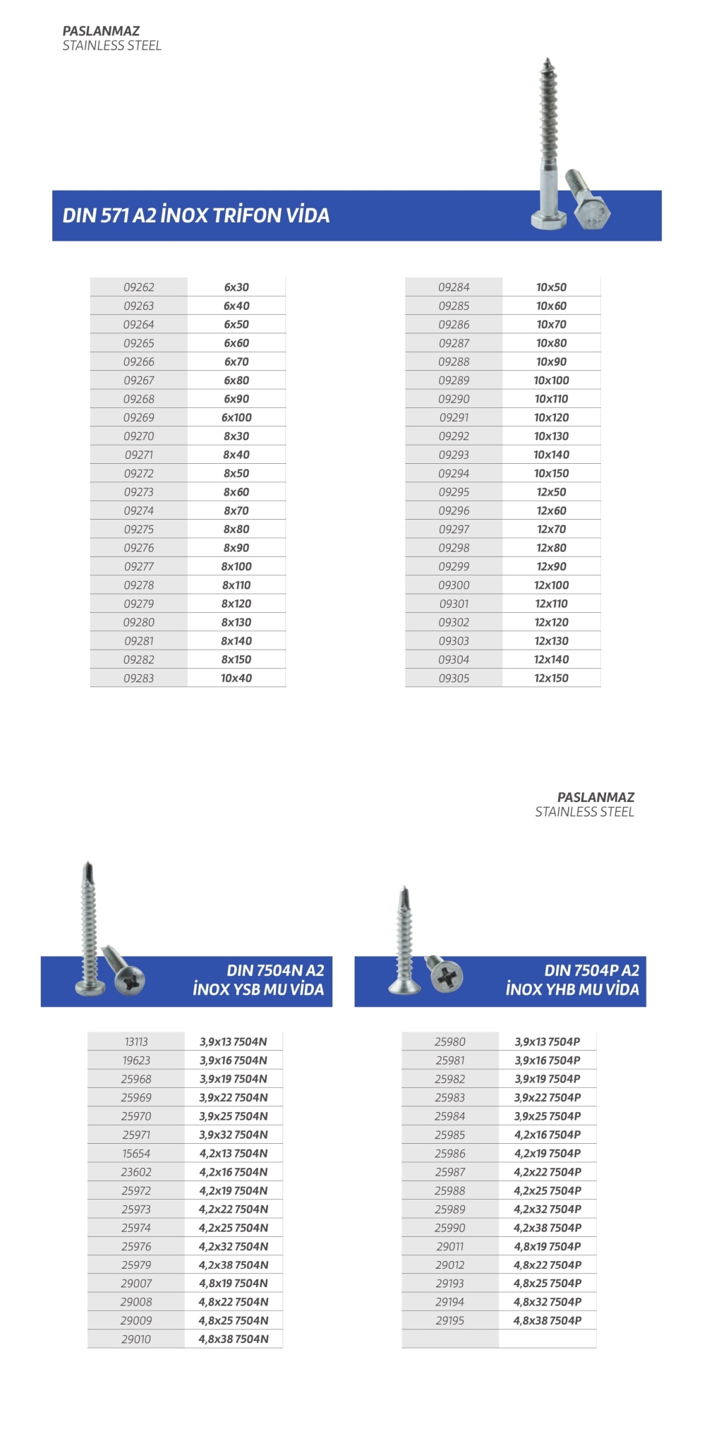 Paslanmaz cıvata,vida,saç vidası,sunta vidası,perçin,somun,rondela,seğmen,gijon vb. özel üretim olan ürün çeşitlerimiz stoklarımızda mevcuttur.