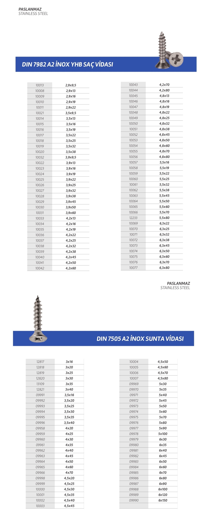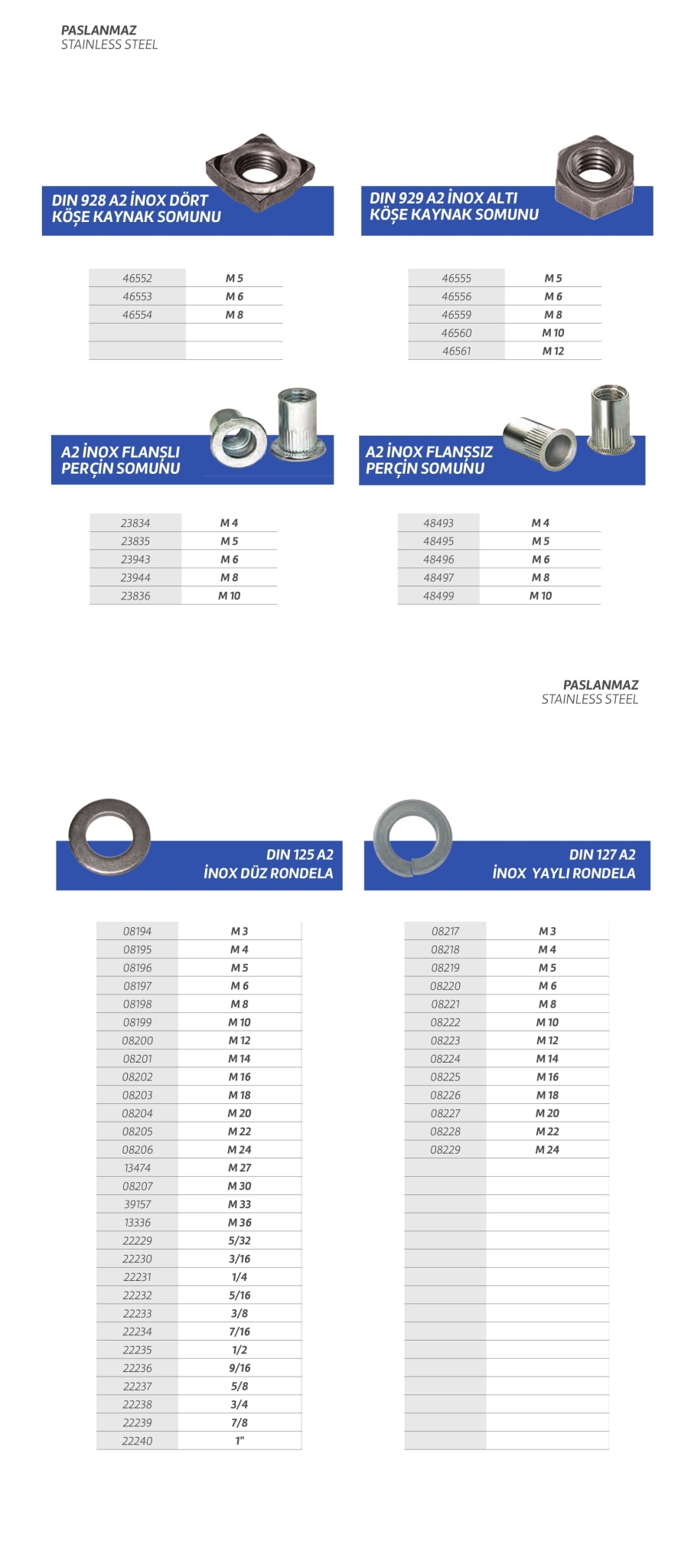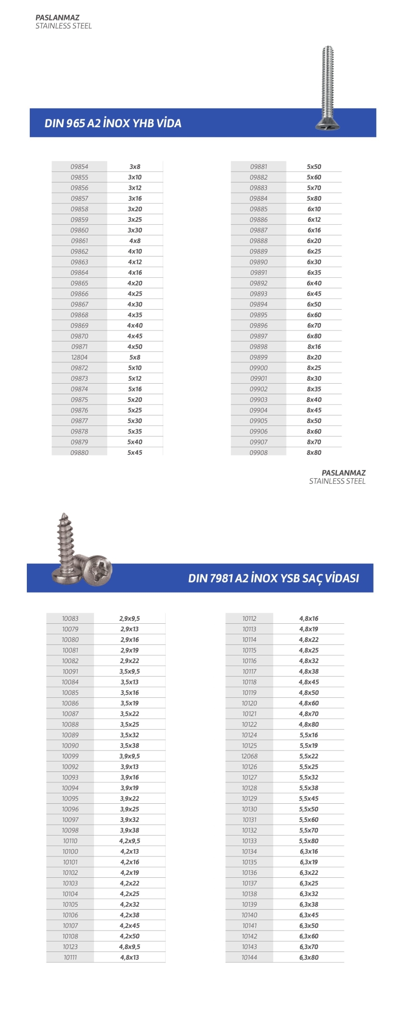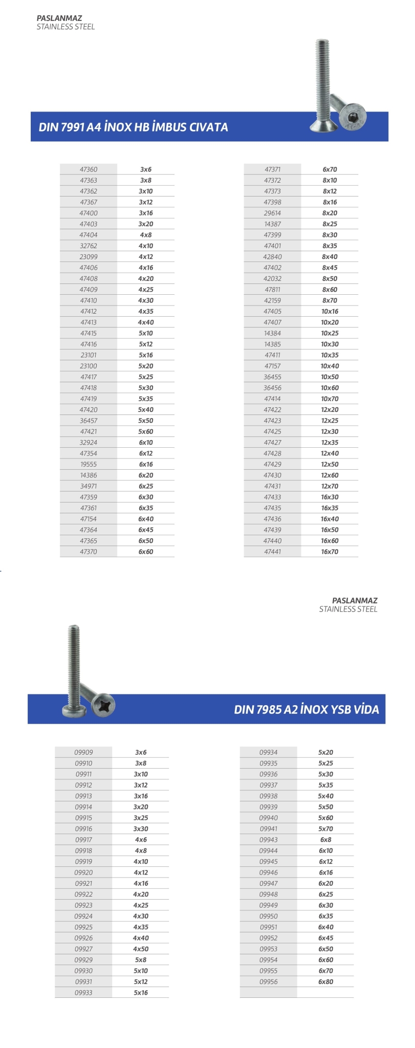 Paslanmaz cıvata,vida,saç vidası,sunta vidası,perçin,somun,rondela,seğmen,gijon vb. özel üretim olan ürün çeşitlerimiz stoklarımızda mevcuttur.