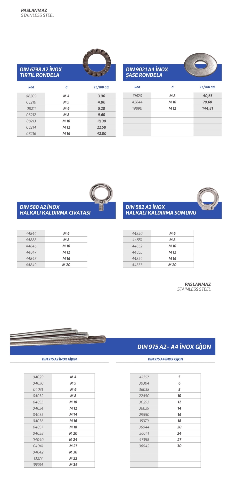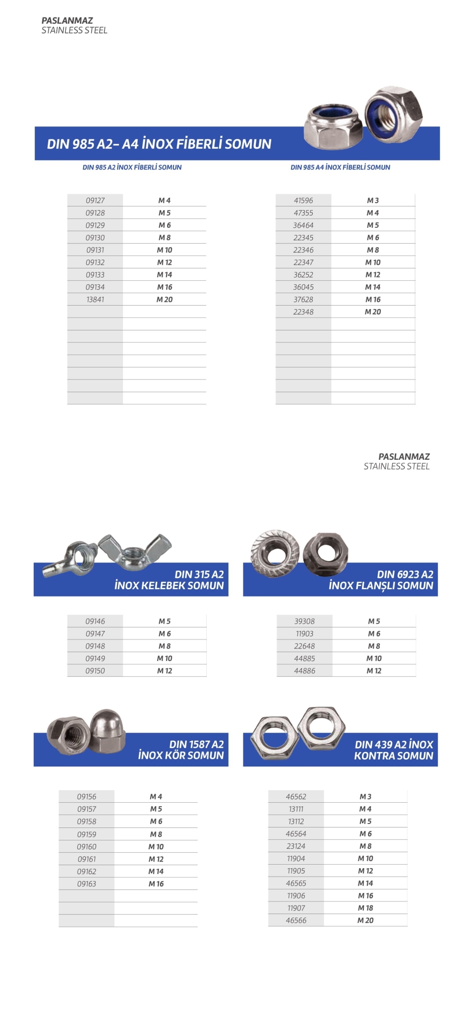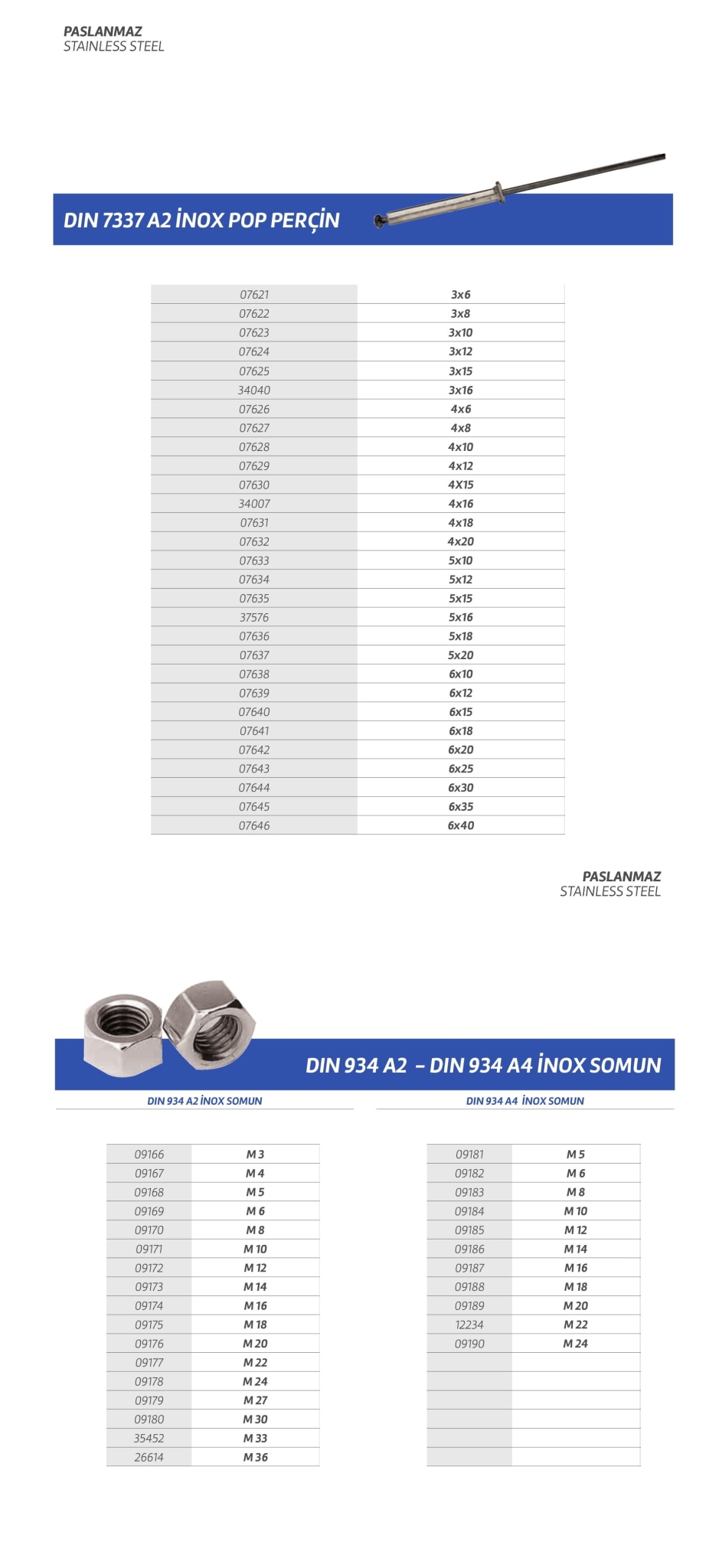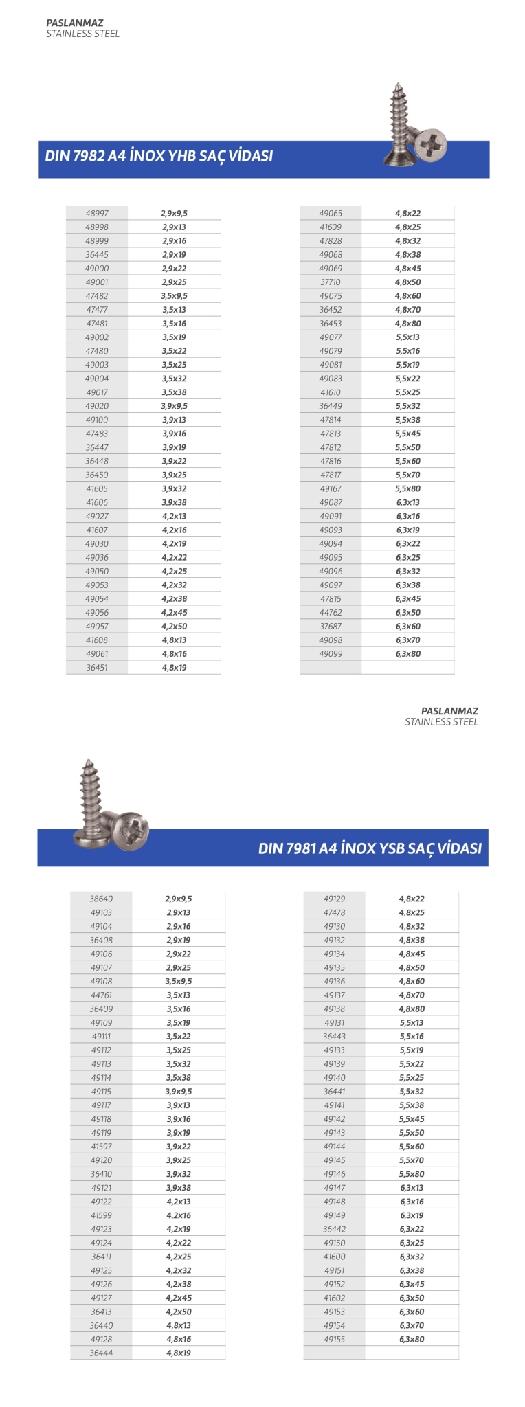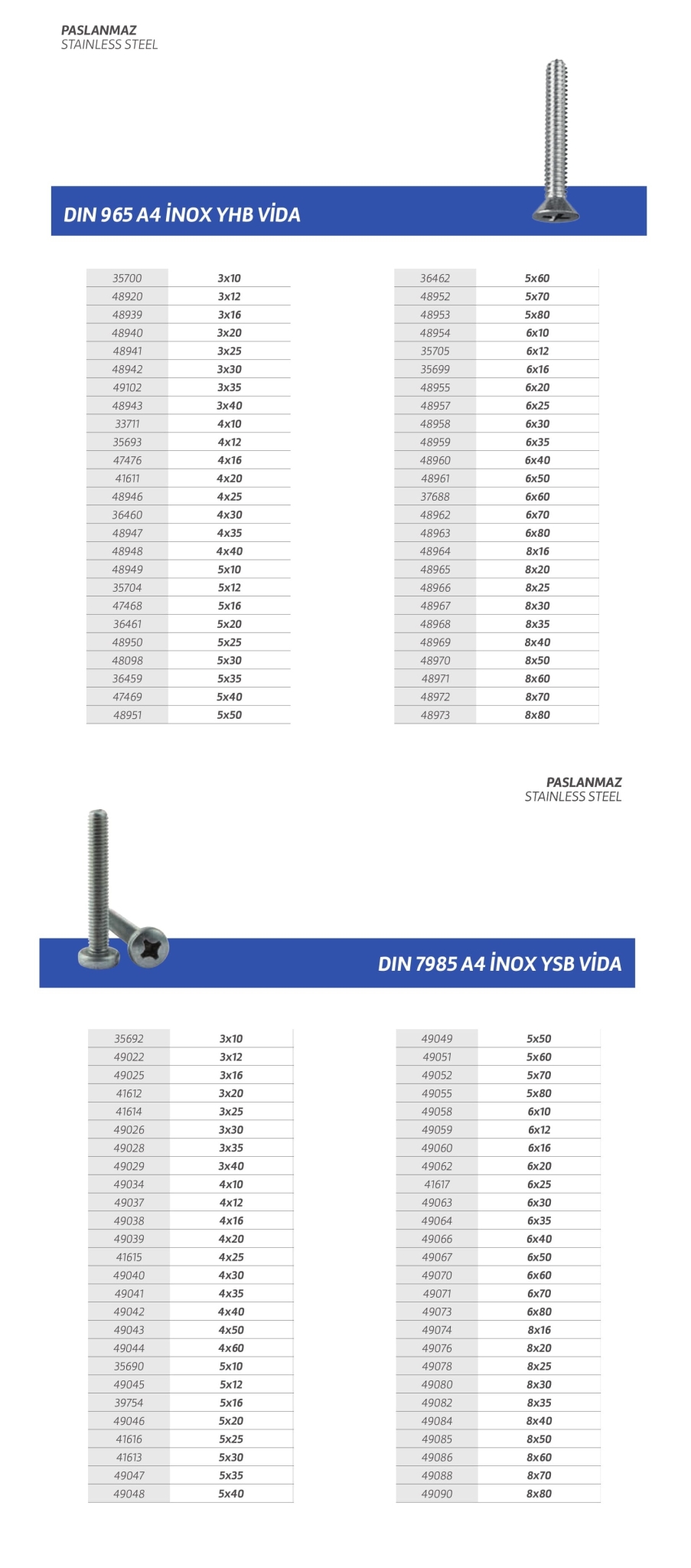 Paslanmaz cıvata,vida,saç vidası,sunta vidası,perçin,somun,rondela,seğmen,gijon vb. özel üretim olan ürün çeşitlerimiz stoklarımızda mevcuttur.