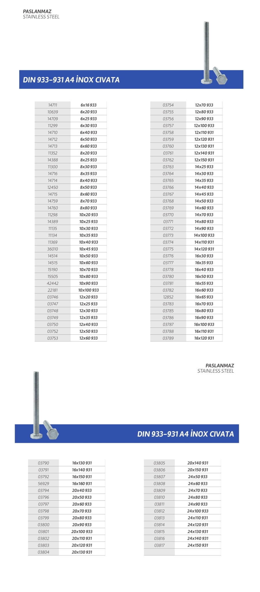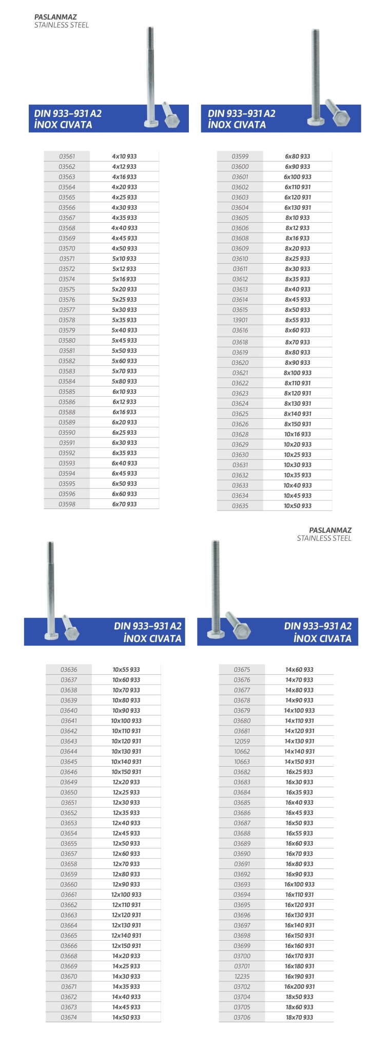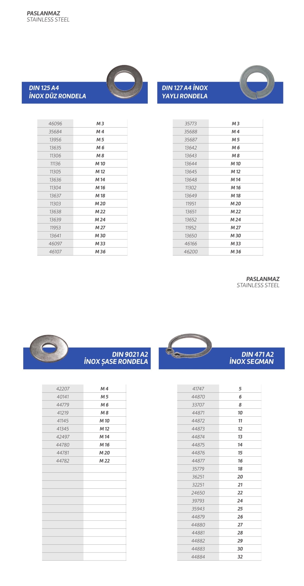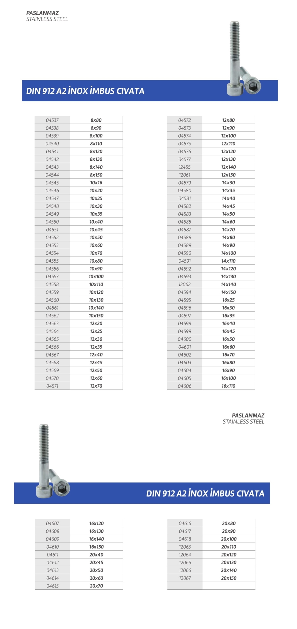 Paslanmaz cıvata,vida,saç vidası,sunta vidası,perçin,somun,rondela,seğmen,gijon vb. özel üretim olan ürün çeşitlerimiz stoklarımızda mevcuttur.